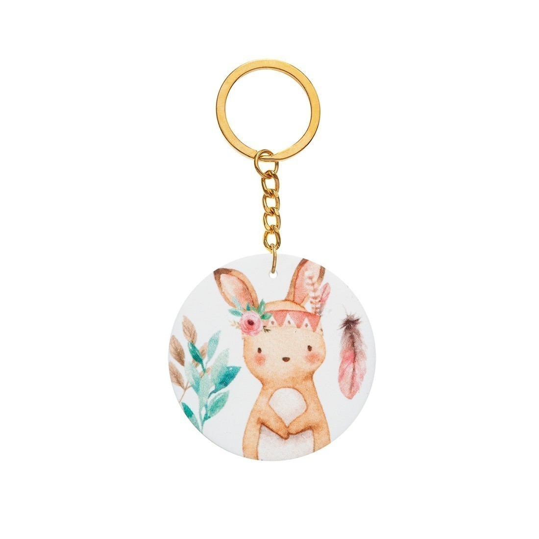 Μπρελόκ με στρογγυλή print παράσταση από plexiglass σε λευκό χρώμα. Η παράσταση απεικονίζει τη λαγουδίνα σε boho style.