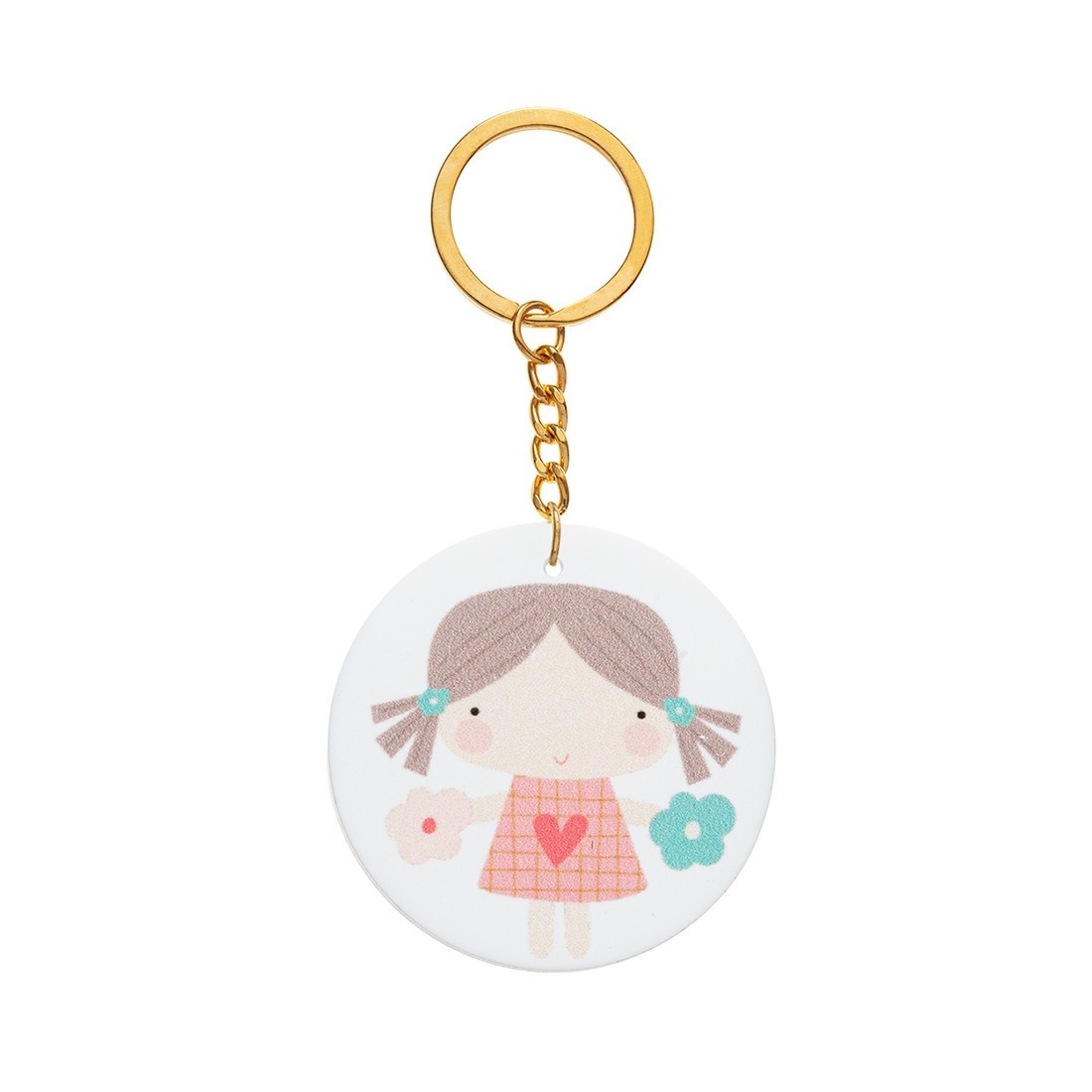 Μπρελόκ με στρογγυλή print παράσταση από plexiglass σε λευκό χρώμα. Η παράσταση απεικονίζει ένα κοριτσάκι σε ροζ girlish αποχρώσεις.