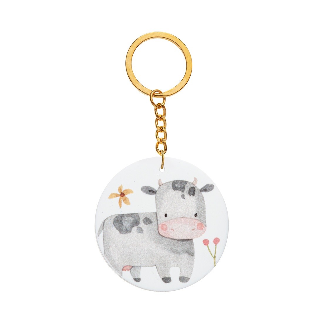 Μπρελόκ με στρογγυλή print παράσταση από plexiglass σε λευκό χρώμα. Η παράσταση απεικονίζει την αγελάδα της φάρμας.