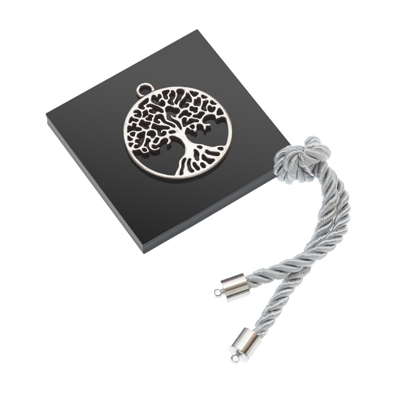 Διακοσμητική βάση plexiglass.H μαύρη βάση είναι διακοσμημένη με μεταλλικό ασημί μοτίφ δέντρο της ζωής και στολισμένη με κορδόνι rayon σε γκρι απόχρωση.