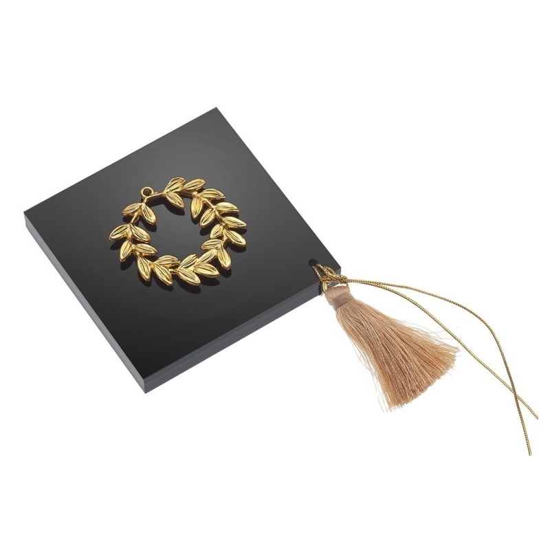 Διακοσμητική βάση plexiglass.H μαύρη βάση είναι διακοσμημένη με μεταλλικό χρυσό μοτίφ στεφάνι και στολισμένη με φουντίτσα σε εκρού απόχρωση.