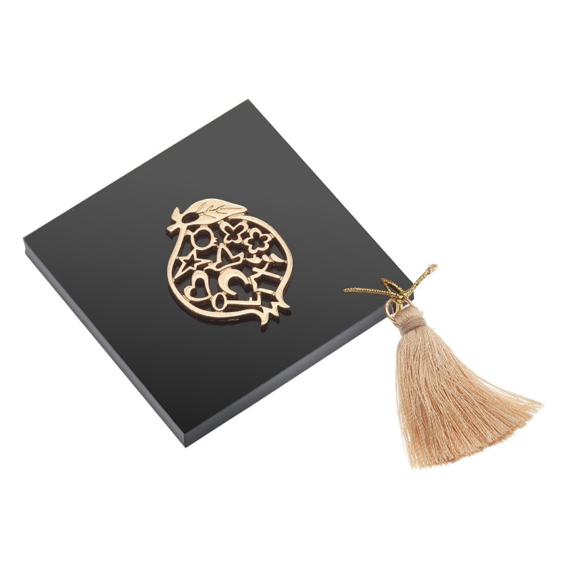 Διακοσμητική βάση plexiglass.H μαύρη βάση είναι διακοσμημένη με μεταλλικό χρυσό μοτίφ ρόδι και στολισμένη με φουντίτσα σε εκρού απόχρωση.