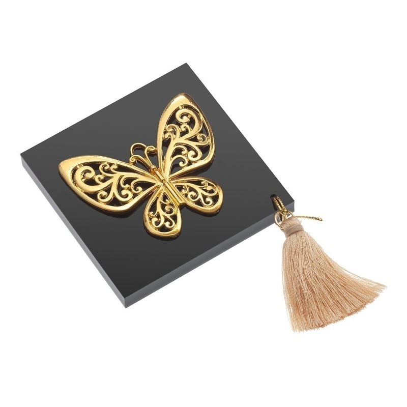 Διακοσμητική βάση plexiglass.H μαύρη βάση είναι διακοσμημένη με μεταλλικό χρυσό μοτίφ πεταλούδα και στολισμένη με φουντίτσα σε εκρού απόχρωση.