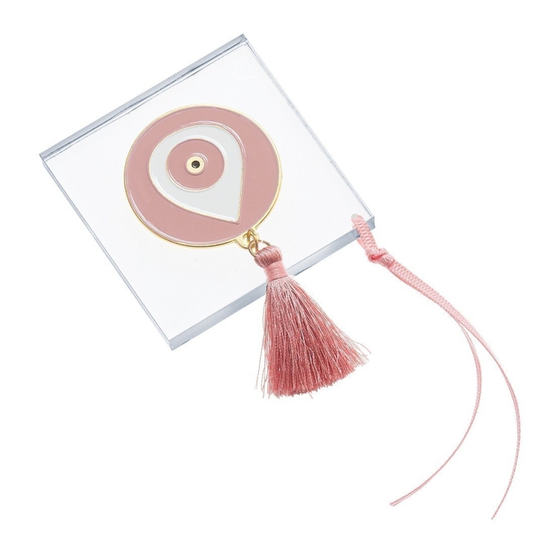 Διακοσμητική βάση plexiglass.H διάφανη βάση είναι διακοσμημένη με μεταλλικό ματάκι σε ροζ αντικέ απόχρωση και στολισμένη με φουντίτσα σε αντίστοιχη απόχρωση.