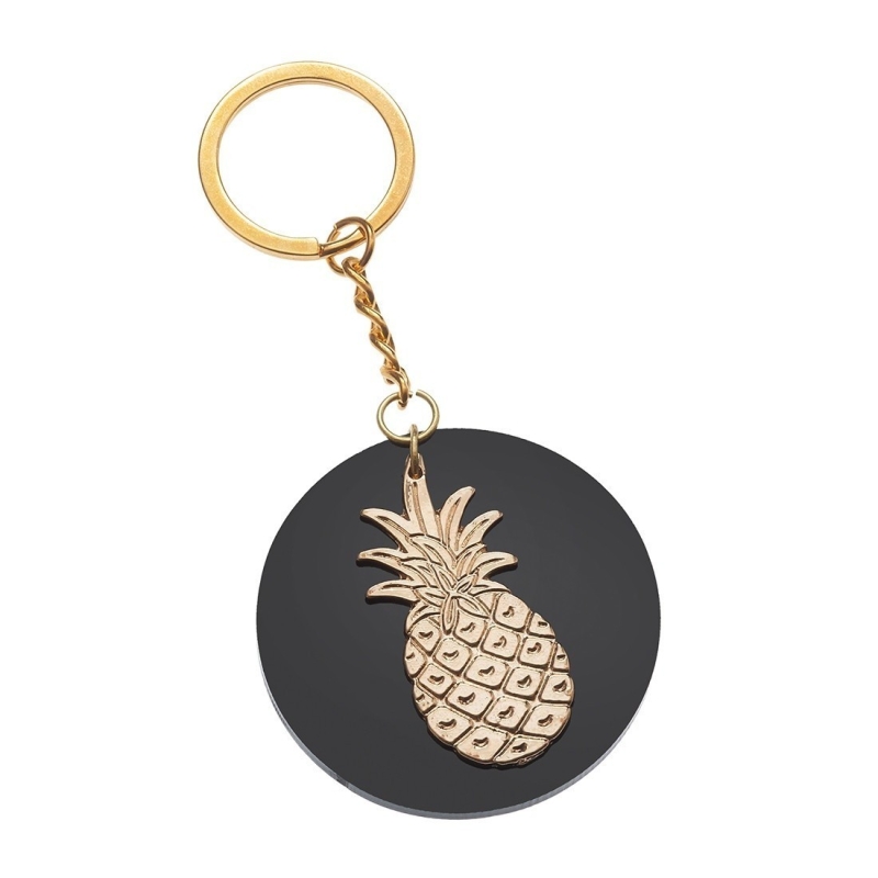 Plexiglass μπρελόκ με μεταλλικό στοιχείο. Το μπρελόκ αποτελείται από μαύρη plexiglass βάση και μεταλλικό χρυσό στοιχείο ανανά.