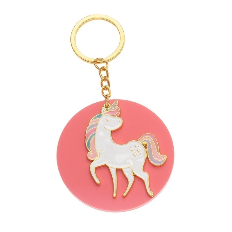 Plexiglass μπρελόκ με μεταλλικό στοιχείο. Το μπρελόκ αποτελείται από ροζ plexiglass βάση και μεταλλικό στοιχείο μονόκερο με πολύχρωμο σμάλτο.