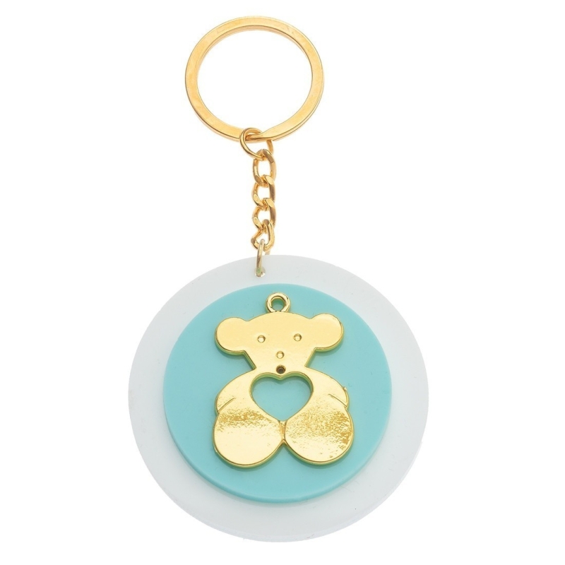 Plexiglass μπρελόκ με μεταλλικό στοιχείο. Η βάση του μπρελόκ αποτελείται από δύο plexiglass σε χρώμα λευκό και βεραμάν με μεταλλικό χρυσό στοιχείο αρκουδάκι.