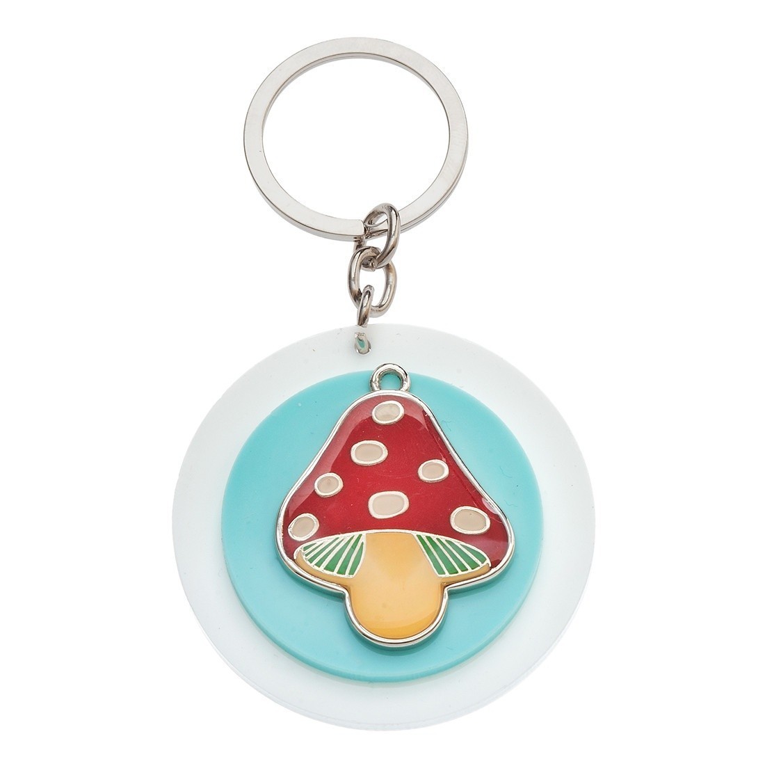 Plexiglass μπρελόκ με μεταλλικό στοιχείο. Η βάση του μπρελόκ αποτελείται από δύο plexiglass σε χρώμα λευκό και σιέλ με μεταλλικό στοιχείο μανιτάρι με σμάλτο σε κόκκινο χρώμα .