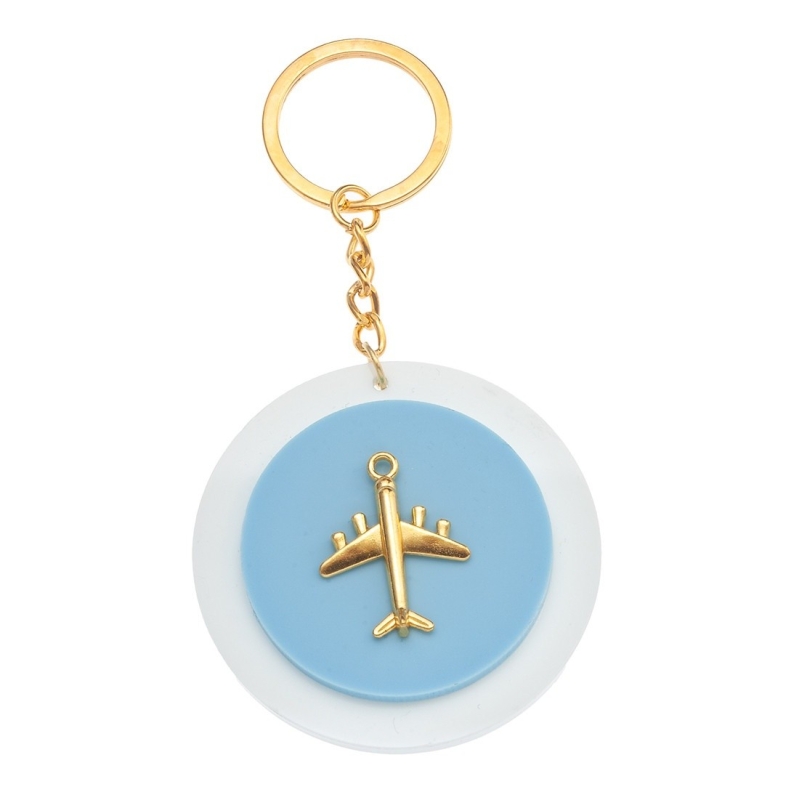 Plexiglass μπρελόκ με μεταλλικό στοιχείο. Η βάση του μπρελόκ αποτελείται από δύο plexiglass σε χρώμα λευκό και σιέλ με μεταλλικό χρυσό στοιχείο αεροπλανάκι .