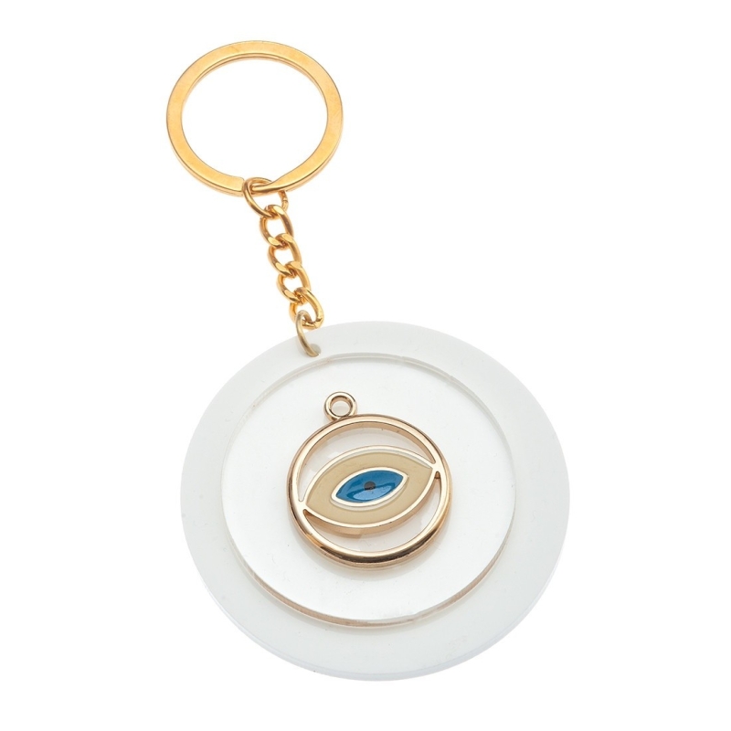 Plexiglass μπρελόκ με μεταλλικό στοιχείο. Η βάση του μπρελόκ αποτελείται από δύο plexiglass σε χρώμα λευκό και διάφανο με μεταλλικό χρυσό ματάκι σε χρώμα σιέλ.