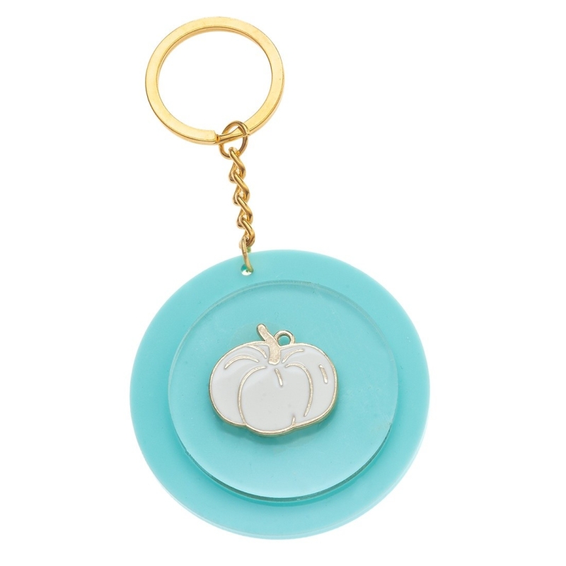 Plexiglass μπρελόκ με μεταλλικό στοιχείο. Η βάση του μπρελόκ αποτελείται από δύο plexiglass σε χρώμα βεραμάν και διάφανο με μεταλλικό χρυσό στοιχείο κολοκύθα με σμάλτο σε λευκό χρώμα .