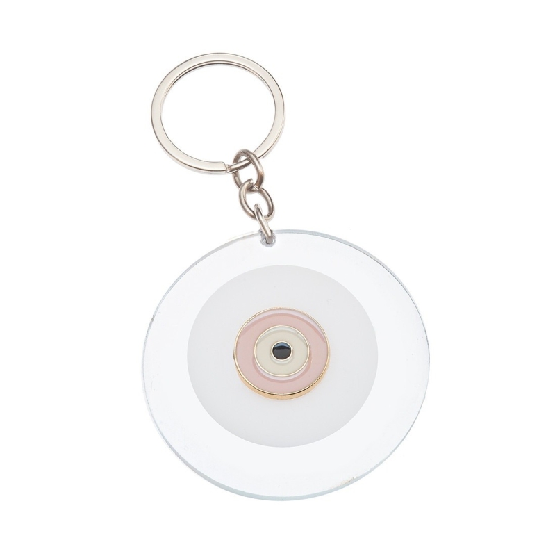 Plexiglass μπρελόκ με μεταλλικό στοιχείο. Η βάση του μπρελόκ αποτελείται από δύο plexiglass σε χρώμα διάφανο και λευκό με μεταλλικό ροζ ματάκι.