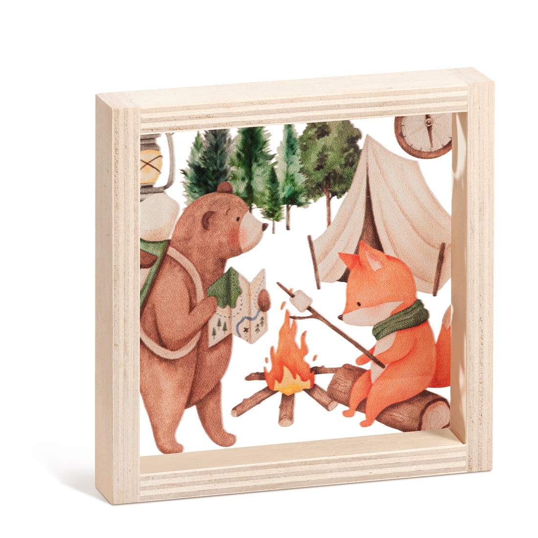 Ξύλινο καδράκι με print plexiglass παράσταση.Η παράσταση απεικονίζει σε διάφανο χρώμα την αρκούδα και την αλεπού που πηγαίνουν capming.