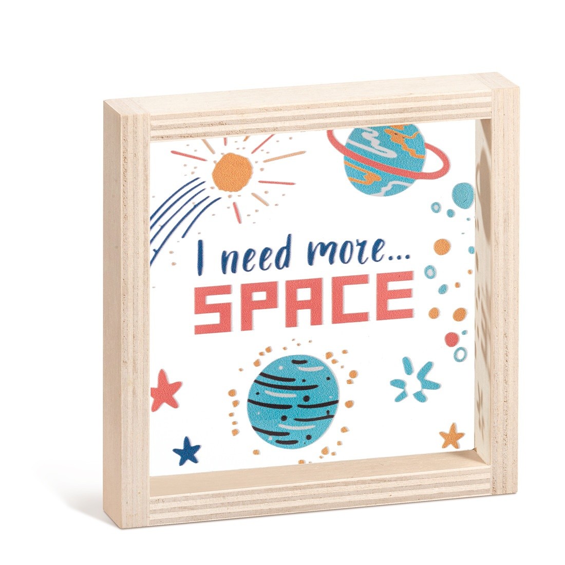 Ξύλινο καδράκι με print plexiglass παράσταση.Η παράσταση απεικονίζει σε διάφανο χρώμα το διάστημα και moto "I need more…SPACE".
