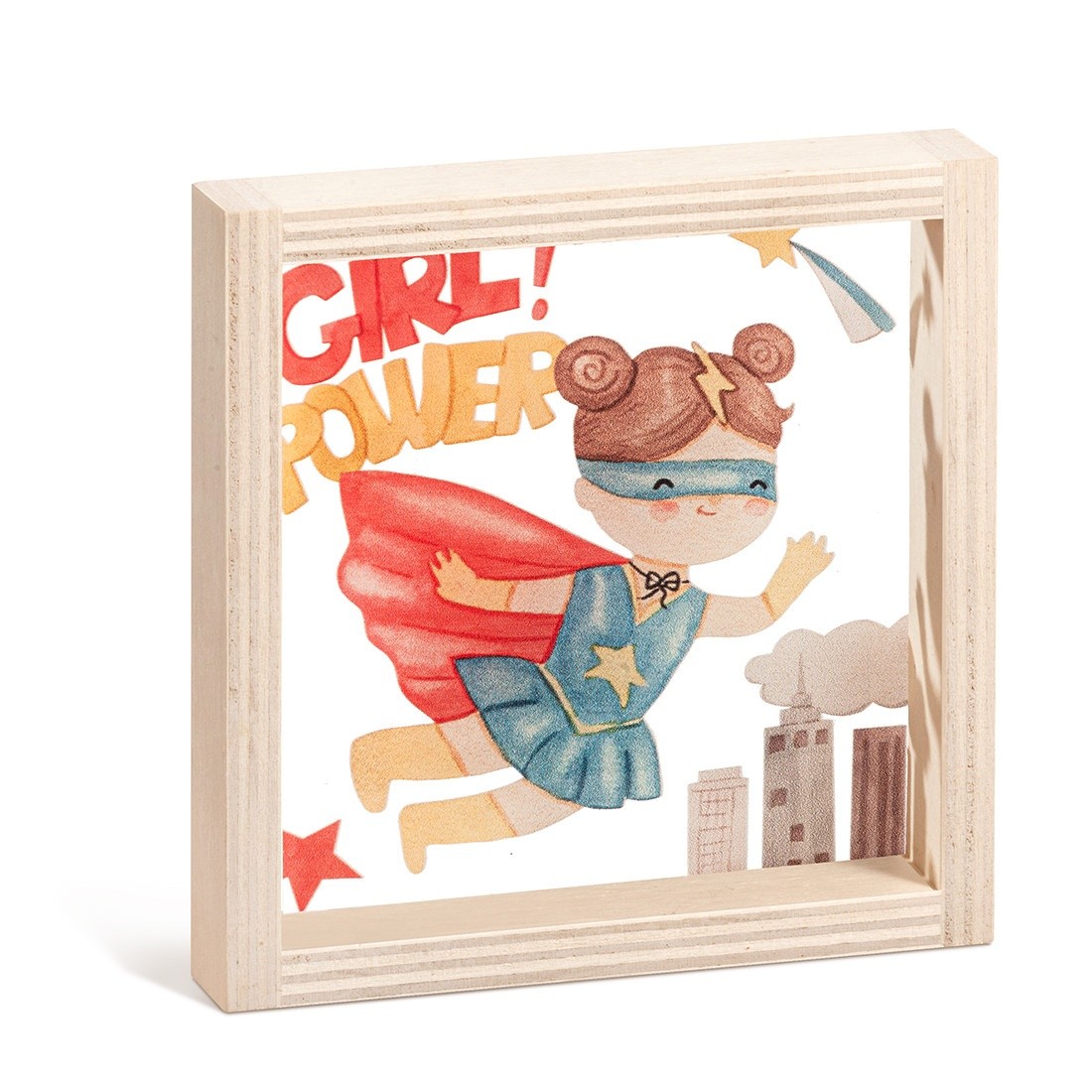 Ξύλινο καδράκι με print plexiglass παράσταση.Η παράσταση απεικονίζει σε διάφανο χρώμα την Super Girl power .