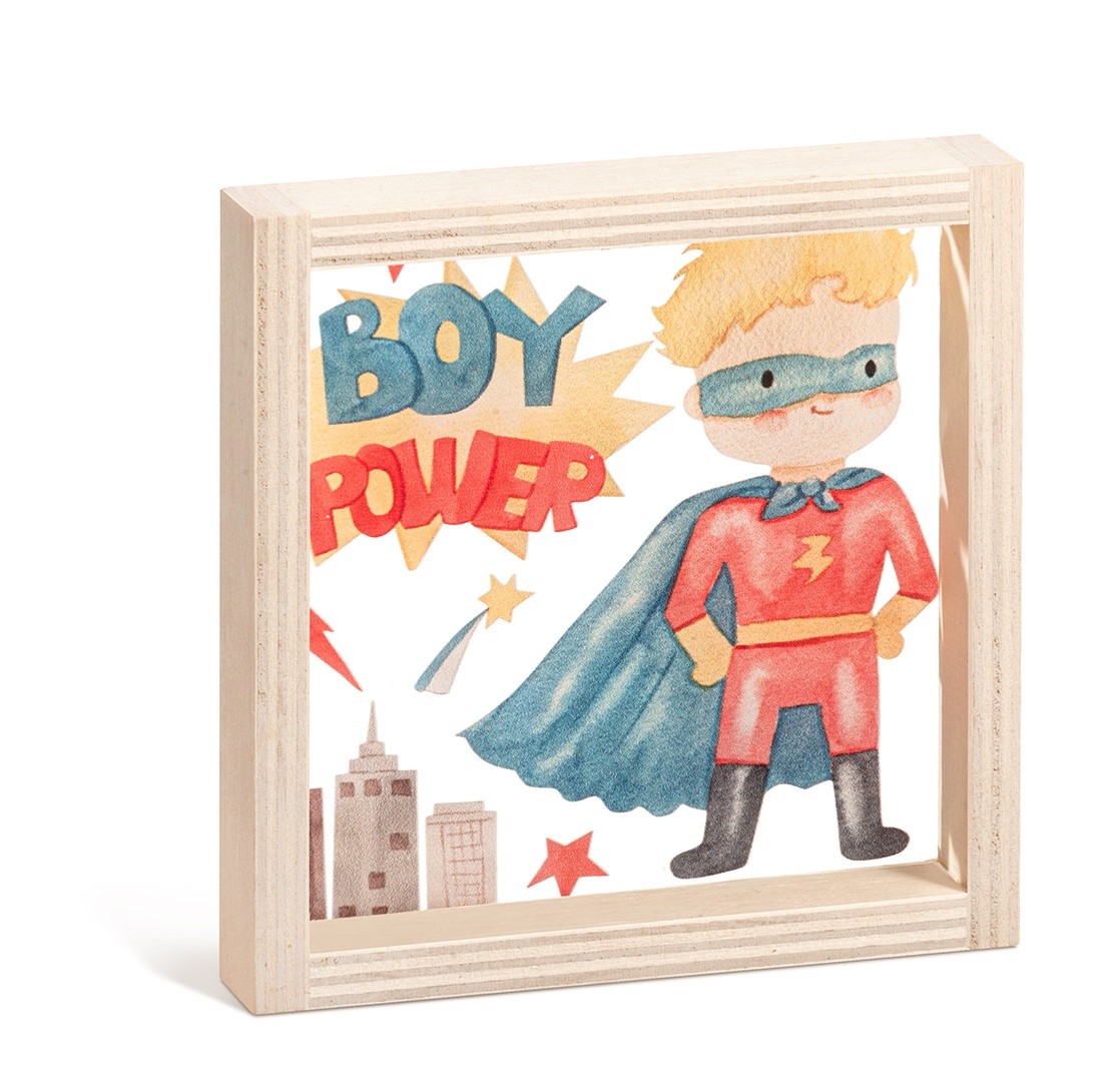 Ξύλινο καδράκι με print plexiglass παράσταση.Η παράσταση απεικονίζει σε διάφανο χρώμα το Super boy Power.