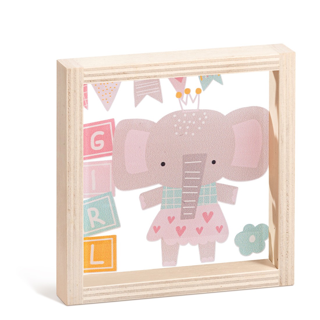 Ξύλινο καδράκι με print plexiglass παράσταση.Η παράσταση απεικονίζει σε διάφανο χρώμα την ελεφαντίνα σε ροζ αποχρώσεις .