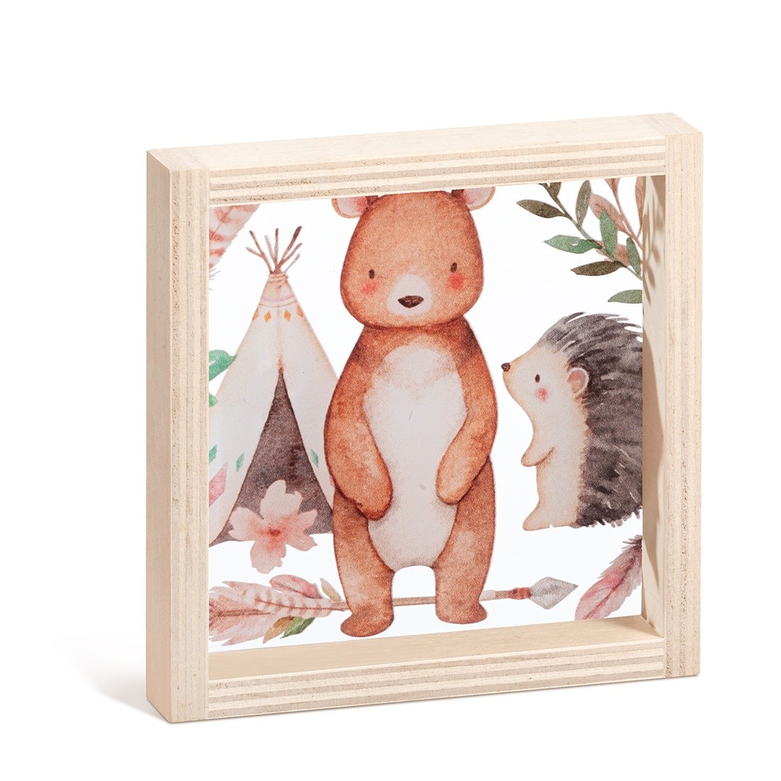 Ξύλινο καδράκι με print plexiglass παράσταση.Η παράσταση απεικονίζει σε διάφανο χρώμα τη λαγουδίνα και τον σκαντζόχοιρο σε boho style..