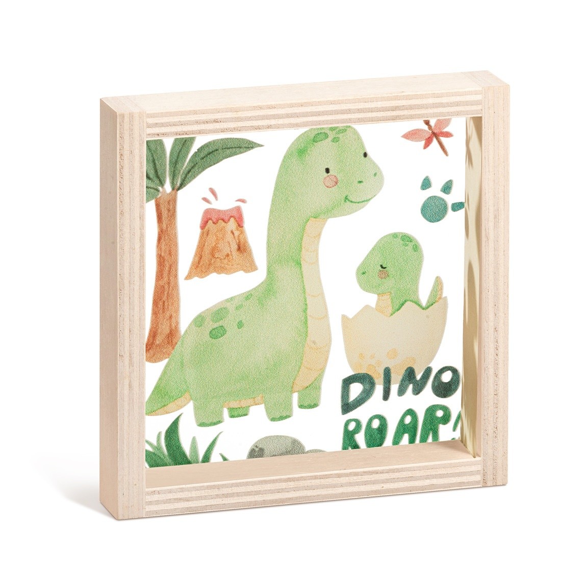 Ξύλινο καδράκι με print plexiglass παράσταση.Η παράσταση απεικονίζει σε διάφανο χρώμα τον Dino το δεινοσαυράκι με φόντο το ηφαίστειο .