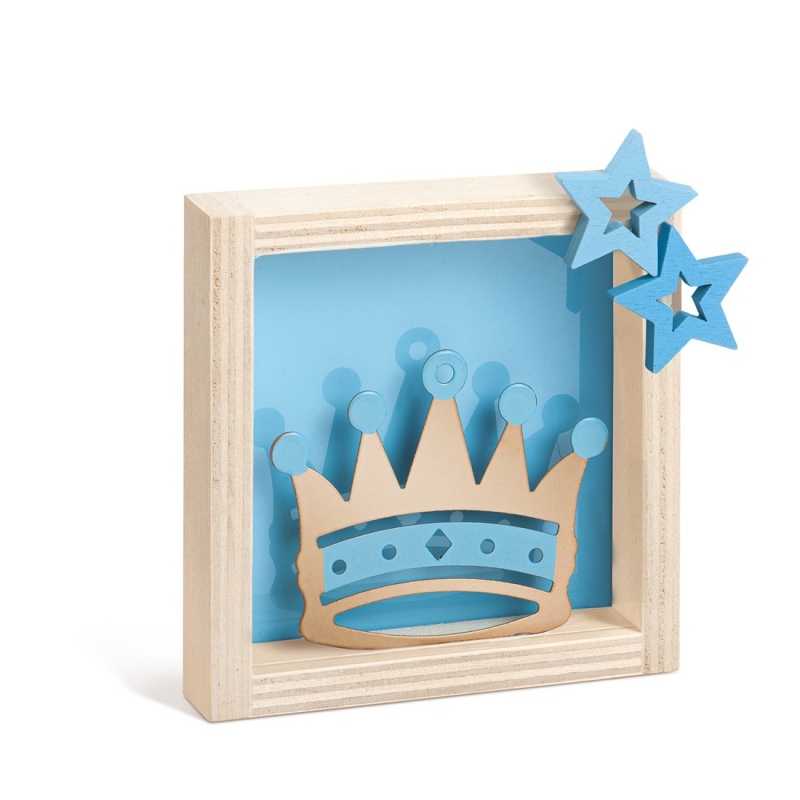 Διακοσμητικό καδράκι με σύνθεση τριών υλικών.Η σύνθεση αποτελείται από : α)μεταλλική κορώνα σε χρυσό και σιελ χρώμα β)ξύλινο τετράγωνο καδράκι σε natural χρώμα γ)plexiglass διακοσμητικά.