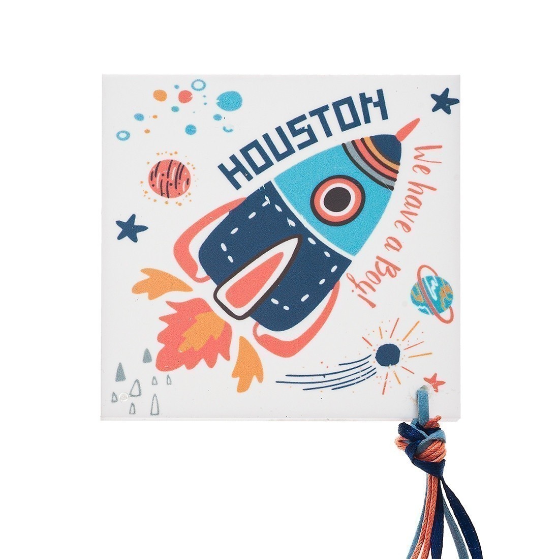 Σουβέρ σε τετράγωνο σχήμα με print plexiglass παράσταση σε λευκό χρώμα. Η παράσταση απεικονίζει τον πύραυλο να απογειώνεται και moto "Houston we have a boy".