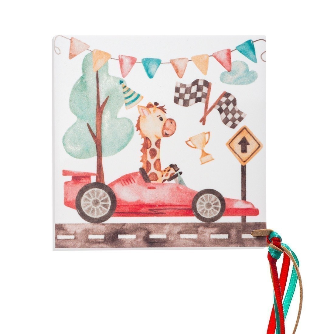 Σουβέρ σε τετράγωνο σχήμα με print plexiglass παράσταση σε λευκό χρώμα. Η παράσταση απεικονίζει την καμηλοπάρδαλη να συμμετέχει σε αγώνες φόρμουλάς.