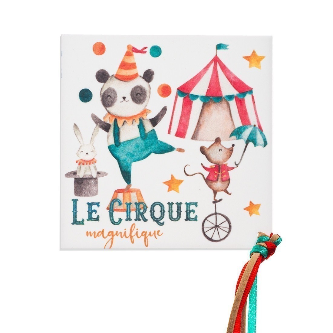 Σουβέρ σε τετράγωνο σχήμα με print plexiglass παράσταση σε λευκό χρώμα. Η παράσταση απεικονίζει το panda να κάνει ακροβατικά με φόντο τη σκηνή του τσίρκου.