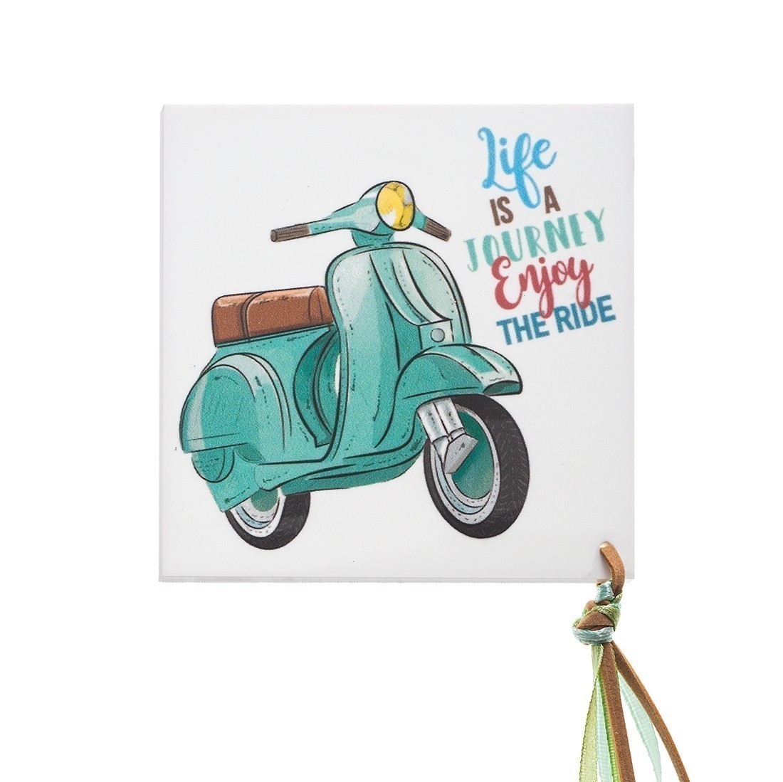 Σουβέρ σε τετράγωνο σχήμα με print plexiglass παράσταση σε λευκό χρώμα. Η παράσταση απεικονίζει τη βεραμάν βέσπα και moto "Life is a journey, enjoy the ride".