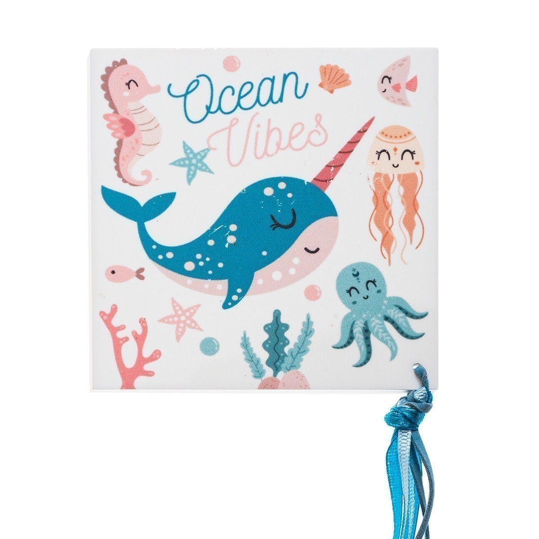 Σουβέρ σε τετράγωνο σχήμα με print plexiglass παράσταση σε λευκό χρώμα. Η παράσταση απεικονίζει το βυθό με τη φάλαινα, τη μέδουσα, το χταπόδι και τον ιππόκαμπο σε "Ocean Vibes".