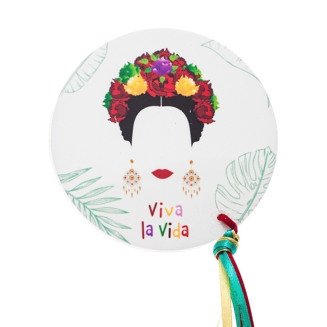 Σουβέρ σε στρογγυλό σχήμα με print plexiglass παράσταση σε λευκό χρώμα. Η παράσταση απεικονίζει την Frida Khalo και moto " Viva la vida".