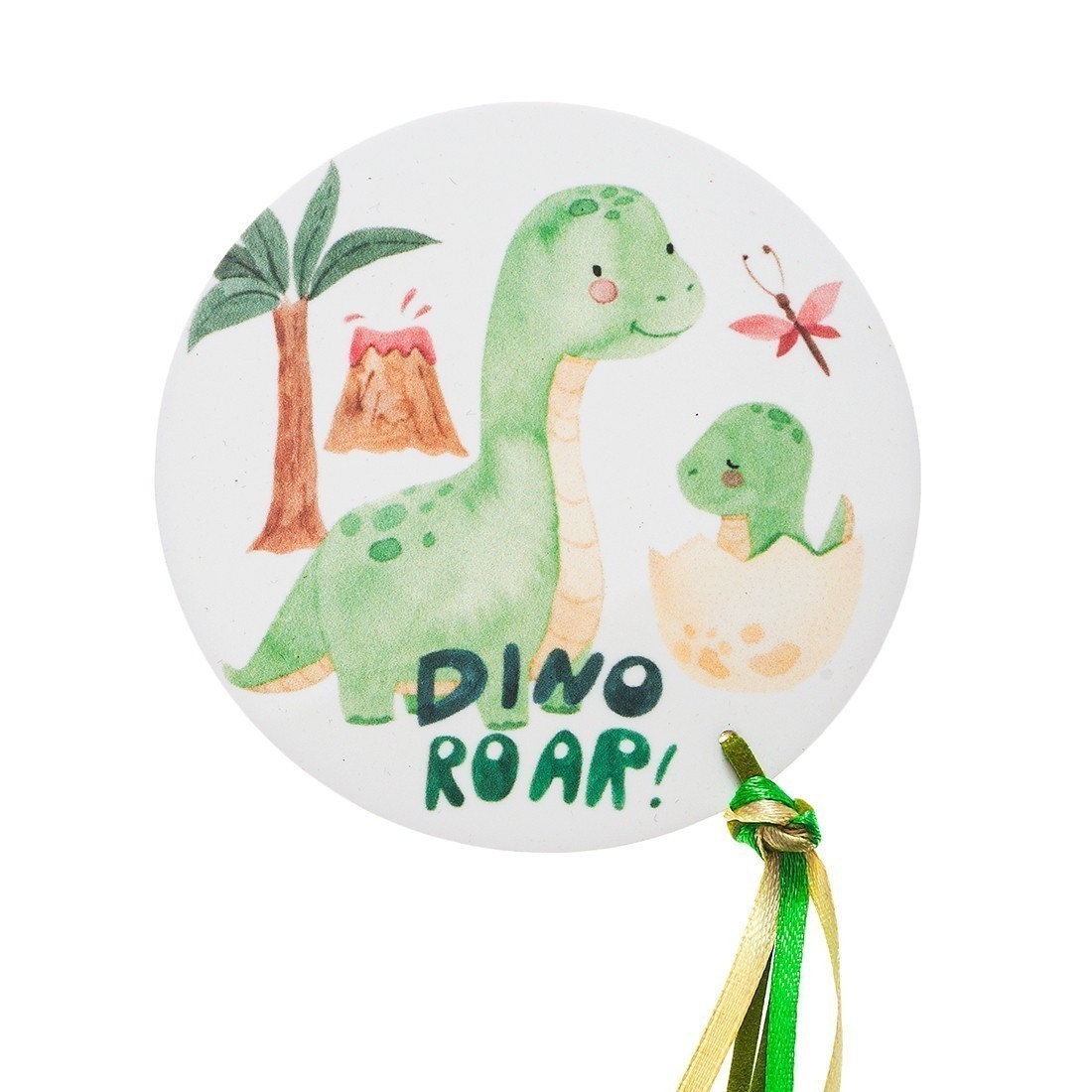 Σουβέρ σε στρογγυλό σχήμα με print plexiglass παράσταση σε λευκό χρώμα. Η παράσταση απεικονίζει τον Dino το δεινοσαυράκι με φόντο το ηφαίστειο .