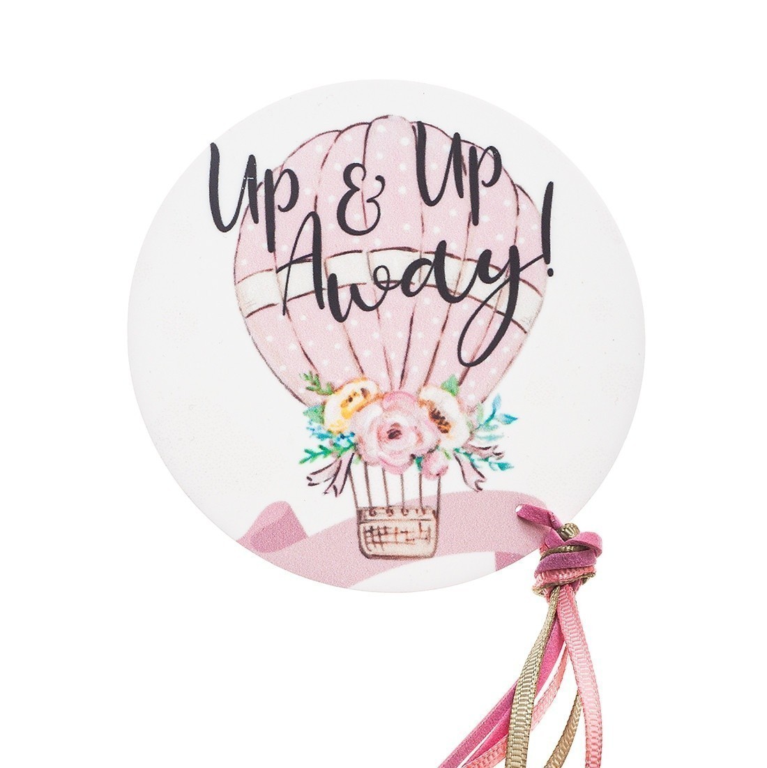 Σουβέρ σε στρογγυλό σχήμα με print plexiglass παράσταση σε λευκό χρώμα. Η παράσταση απεικονίζει το αερόστατο σε ροζ χρώμα και moto "up, up & away".