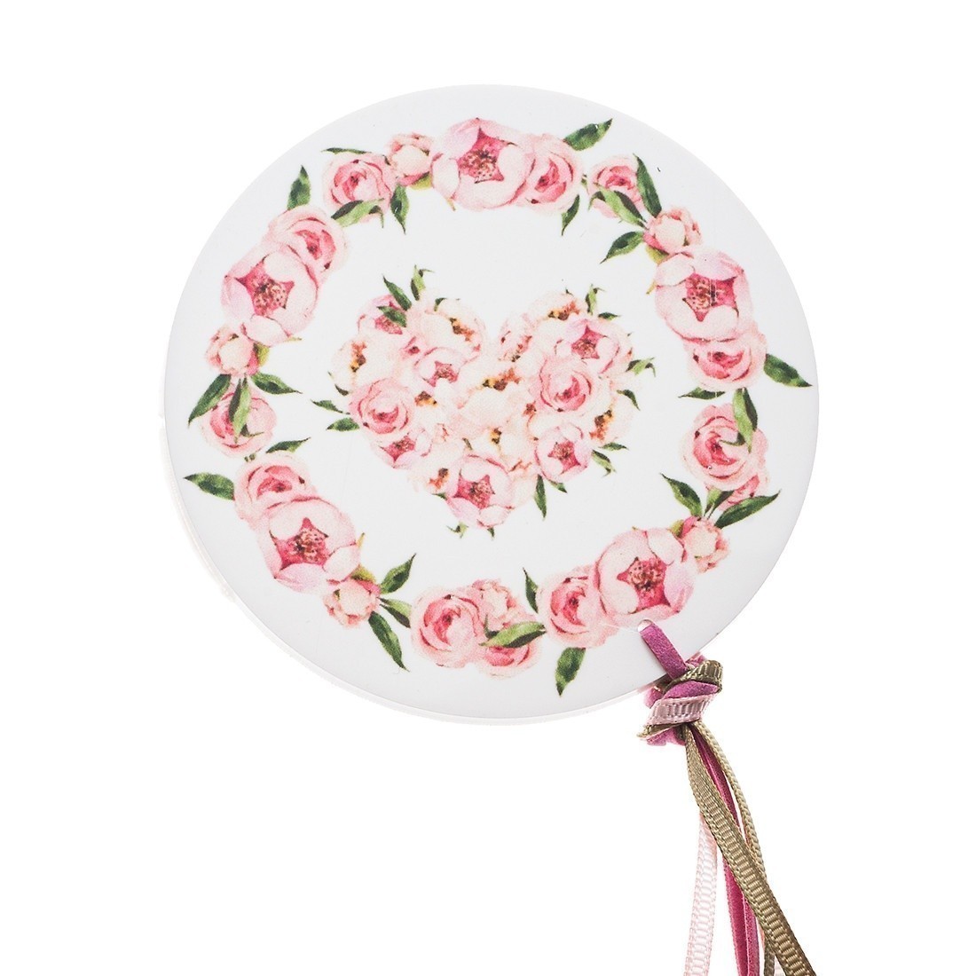 Σουβέρ σε στρογγυλό σχήμα με print plexiglass παράσταση σε λευκό χρώμα. Η παράσταση απεικονίζει ένα μπουκέτο με ροζ παιώνιες σε σχήμα καρδιάς .