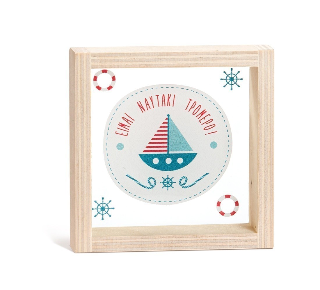 Ξύλινο καδράκι με print plexiglass παράσταση.Η παράσταση απεικονίζει σε διάφανο χρώμα το κλασσικό ναυτικό θέμα με το καραβάκι και moto "είμαι ναυτάκι τρομερό".