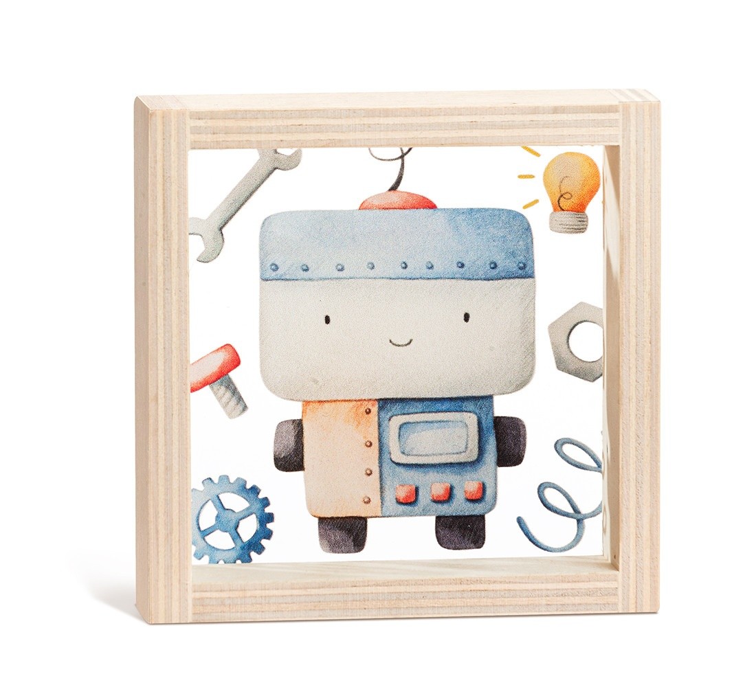 Ξύλινο καδράκι με print plexiglass παράσταση.Η παράσταση απεικονίζει σε διάφανο χρώμα ένα ρομπότ με φόντο διάφορα εργαλεία.