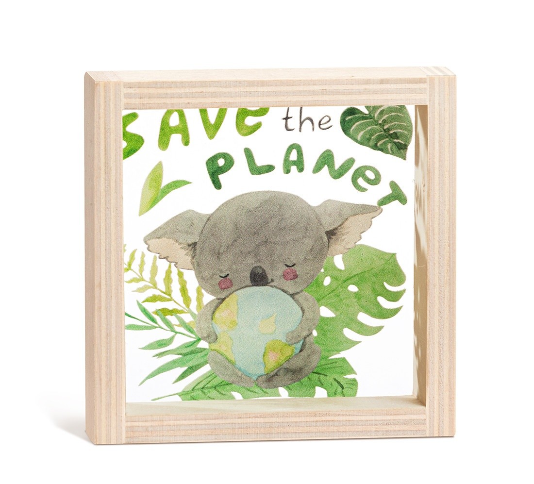 Ξύλινο καδράκι με print plexiglass παράσταση.Η παράσταση απεικονίζει σε διάφανο χρώμα το κοάλα αγκαλιά με την υδρόγειο να στέλνει το μήνυμα "Save the Planet".