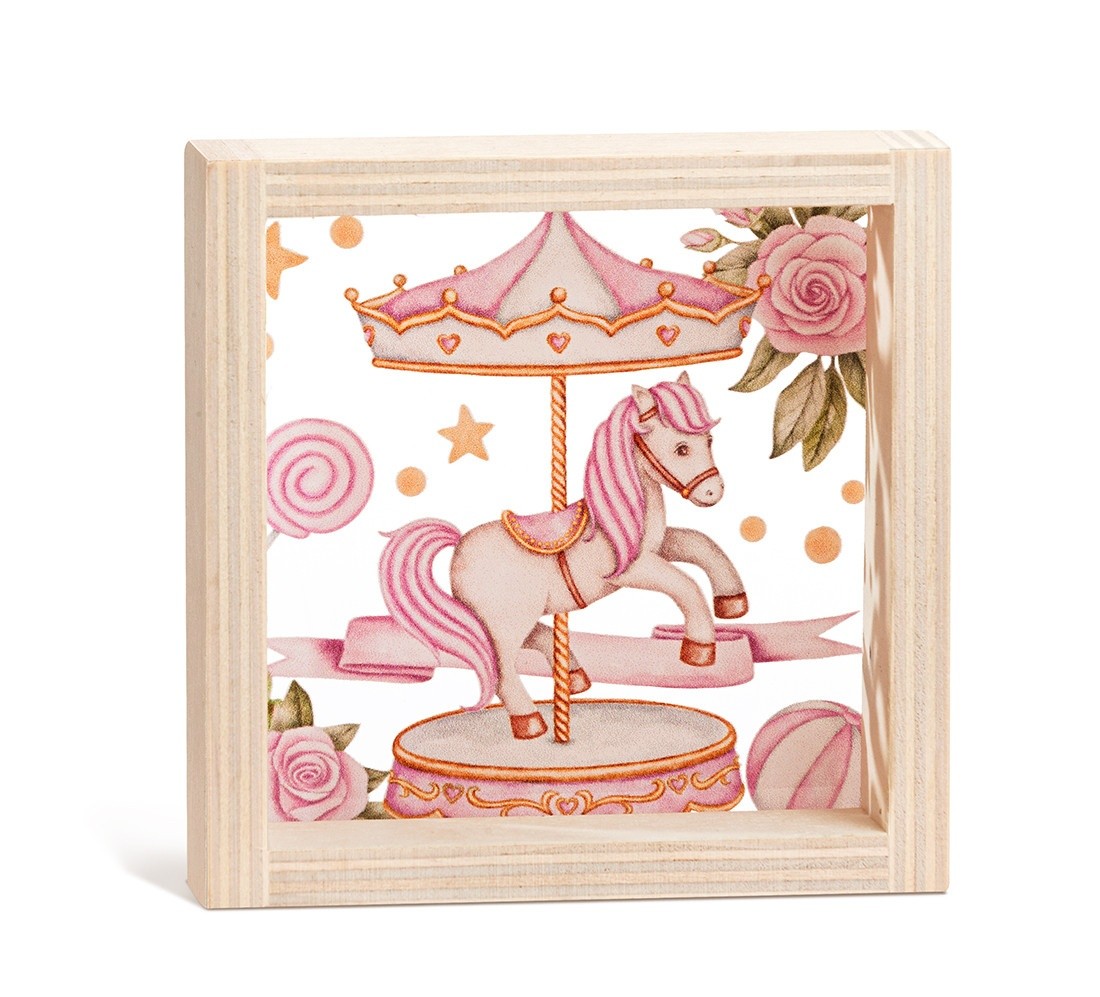 Ξύλινο καδράκι με print plexiglass παράσταση.Η παράσταση απεικονίζει σε διάφανο χρώμα το καρουζέλ σε ροζ απόχρωση.