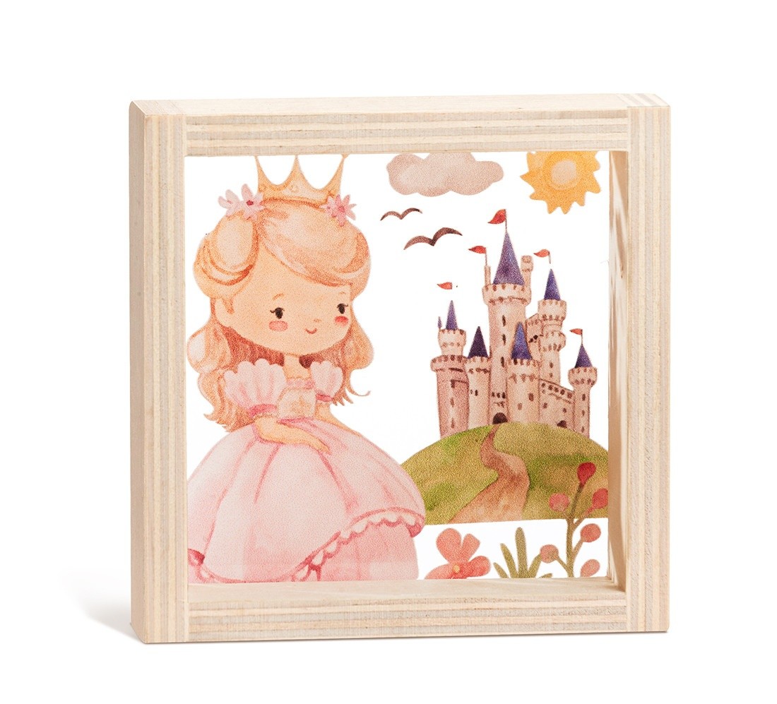 Ξύλινο καδράκι με print plexiglass παράσταση.Η παράσταση απεικονίζει σε διάφανο χρώμα την πριγκίπισσα του παραμυθιού με φόντο το κάστρο.
