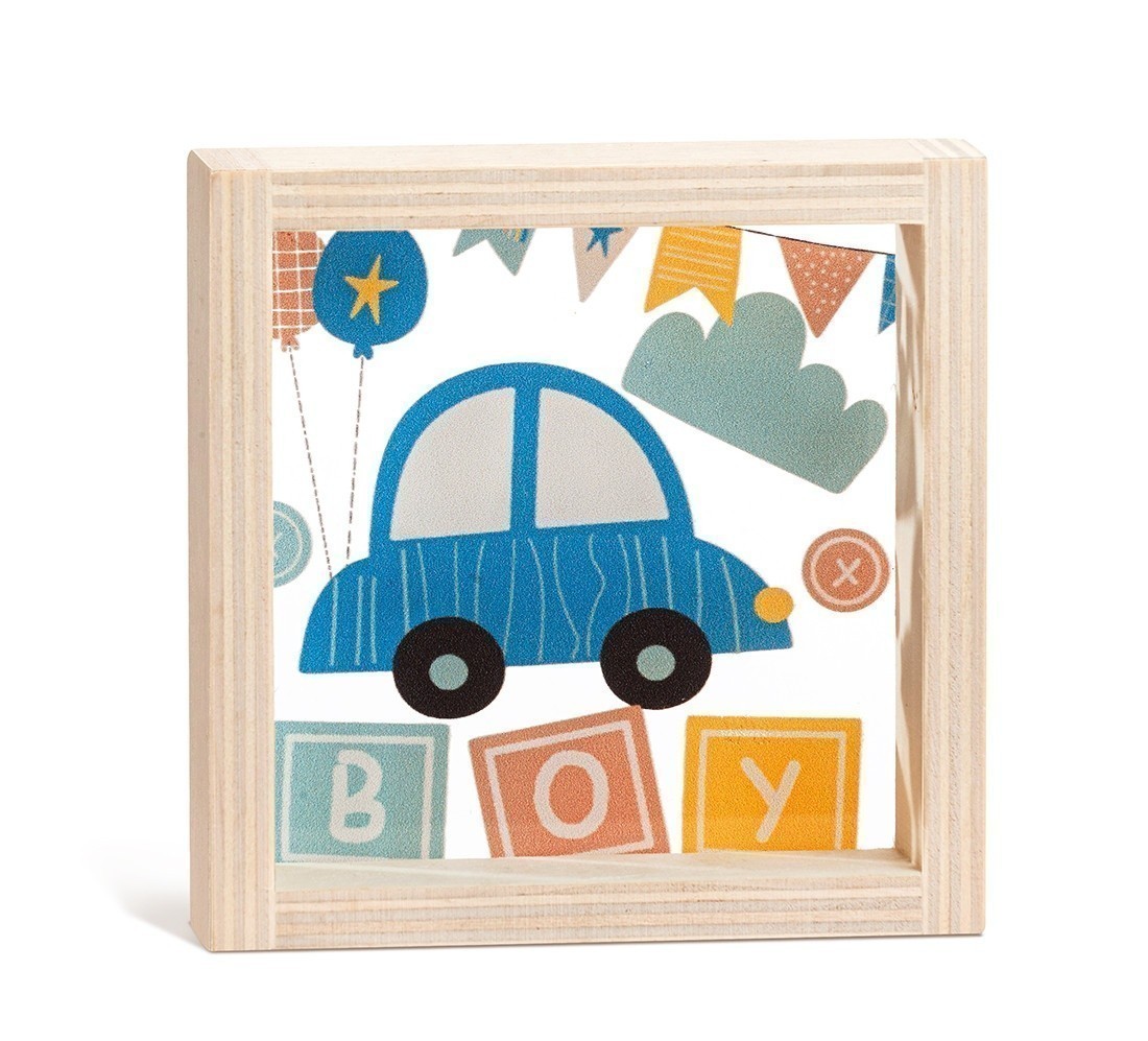 Ξύλινο καδράκι με print plexiglass παράσταση.Η παράσταση απεικονίζει σε διάφανο χρώμα ένα παιδικό αυτοκίνητάκι σε σιέλ αποχρώσεις.