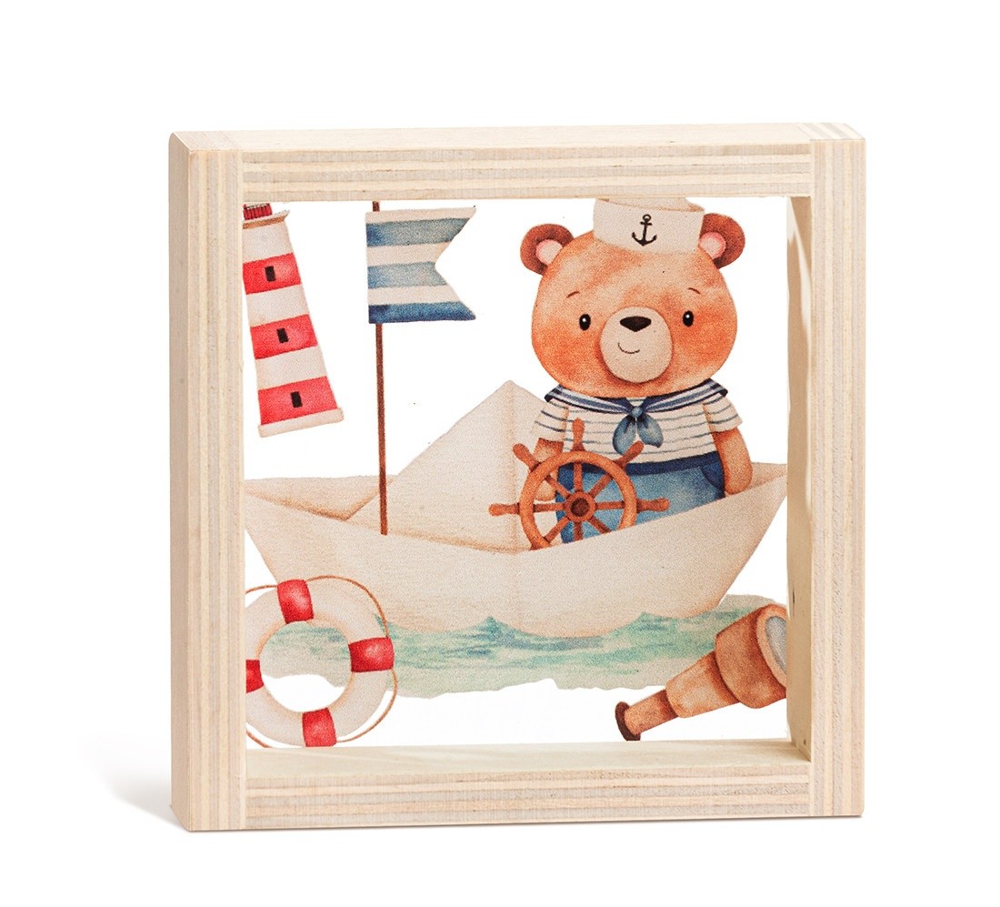 Ξύλινο καδράκι με print plexiglass παράσταση.Η παράσταση απεικονίζει σε διάφανο χρώμα το αρκουδάκι ναυτάκι να αρμενίζει με τη βαρκούλα του.