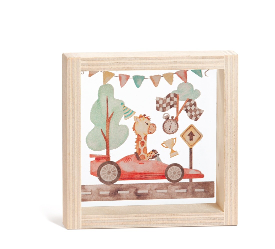 Ξύλινο καδράκι με print plexiglass παράσταση.Η παράσταση απεικονίζει σε διάφανο χρώμα την καμηλοπάρδαλη να συμμετέχει σε αγώνες φόρμουλάς.