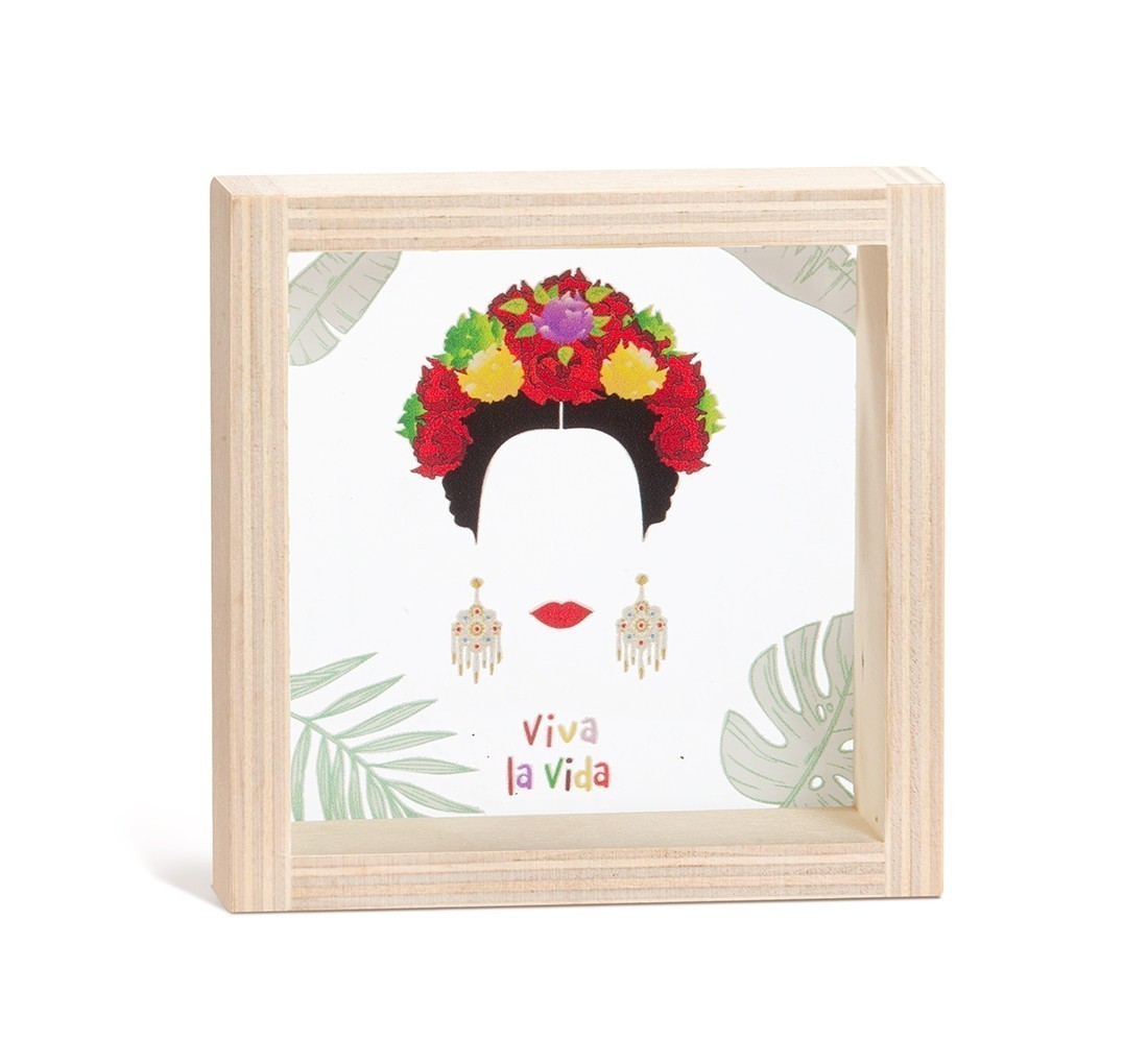 Ξύλινο καδράκι με print plexiglass παράσταση.Η παράσταση απεικονίζει σε διάφανο χρώμα την Frida Khalo και moto " Viva la vida".
