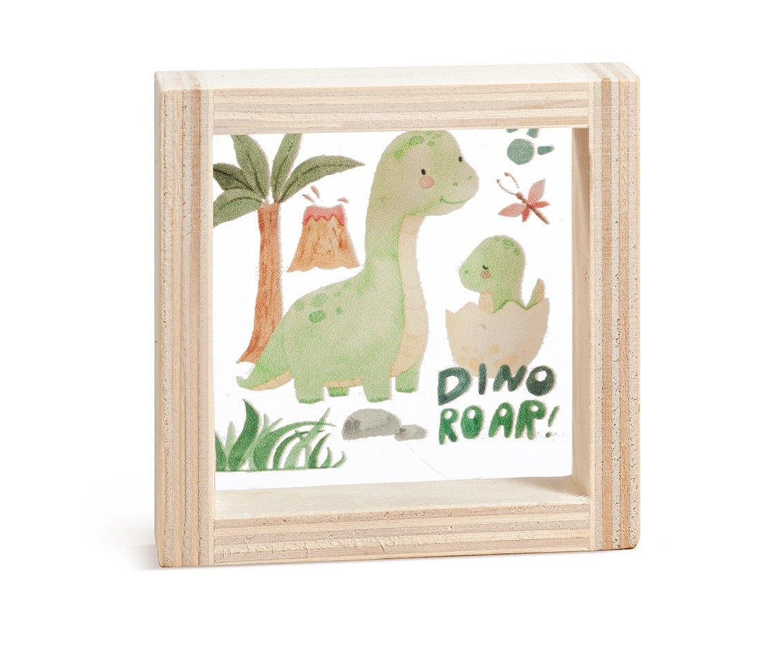 Ξύλινο καδράκι με print plexiglass παράσταση.Η παράσταση απεικονίζει σε διάφανο χρώμα τον Dino το δεινοσαυράκι με φόντο το ηφαίστειο.