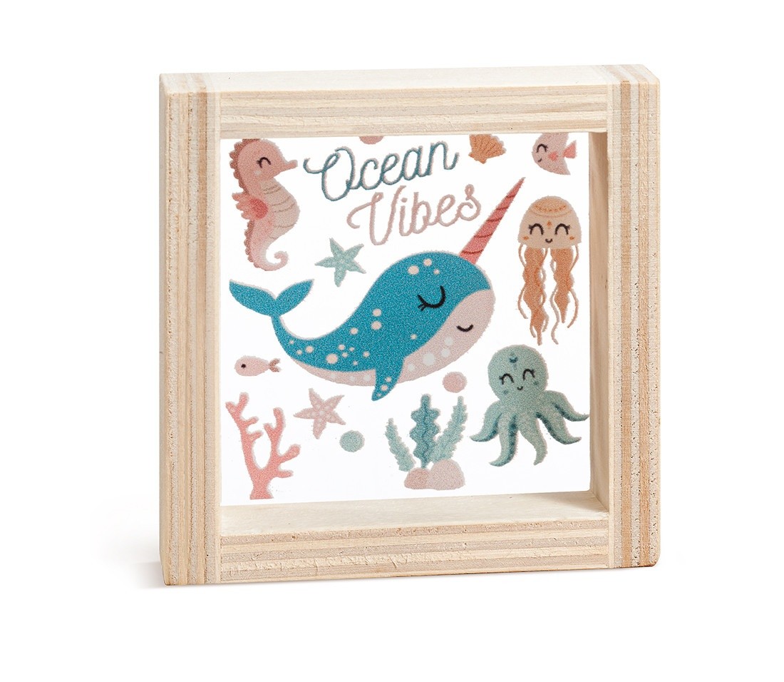 Ξύλινο καδράκι με print plexiglass παράσταση.Η παράσταση απεικονίζει σε διάφανο χρώμα το βυθό με τη φάλαινα, τη μέδουσα και το χταπόδι.