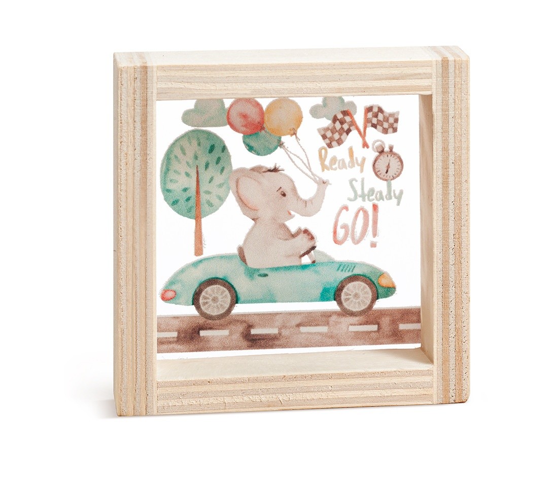 Ξύλινο καδράκι με print plexiglass παράσταση.Η παράσταση απεικονίζει σε διάφανο χρώμα το ελεφαντάκι να συμμετέχει σε αγώνες φόρμουλας και σύνθημα "READY, STEADY, GO".