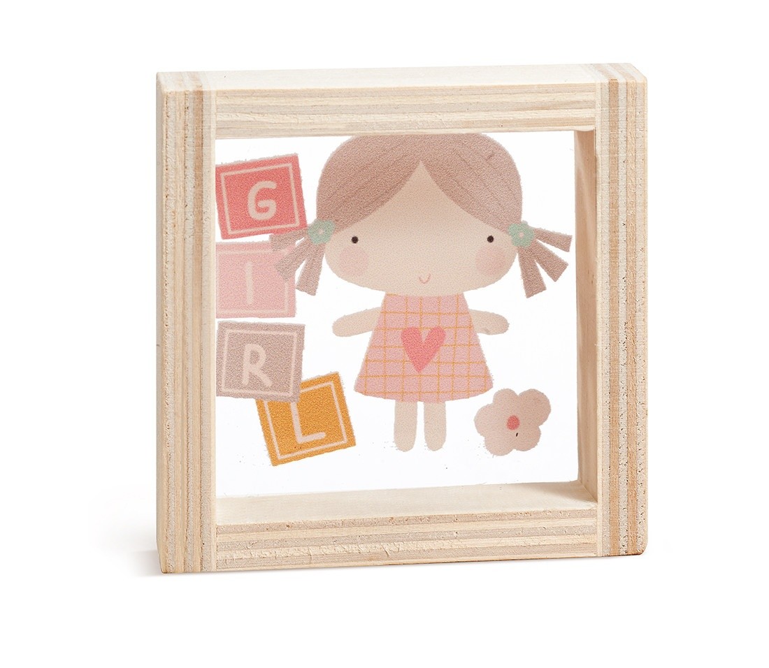 Ξύλινο καδράκι με print plexiglass παράσταση.Η παράσταση απεικονίζει σε διάφανο χρώμα ένα κοριτσάκι σε ροζ girlish αποχρώσεις.