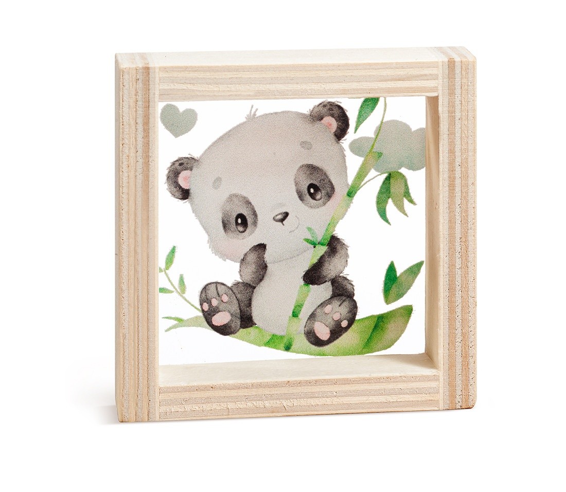 Ξύλινο καδράκι με print plexiglass παράσταση.Η παράσταση απεικονίζει σε διάφανο χρώμα την κλασσική φιγούρα του panda με τον ευκάλυπτο.