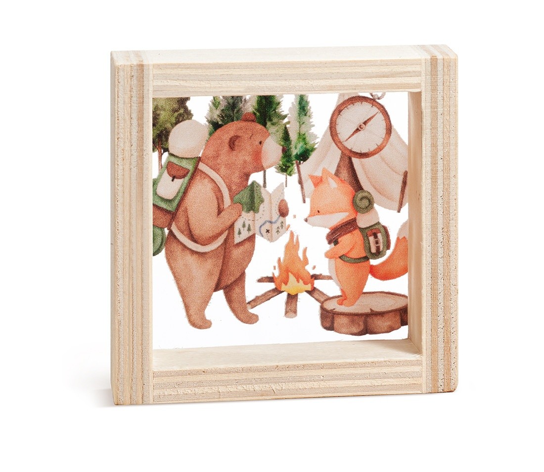 Ξύλινο καδράκι με print plexiglass παράσταση.Η παράσταση απεικονίζει σε διάφανο χρώμα την αρκούδα και την αλεπού που πηγαίνουν capming.