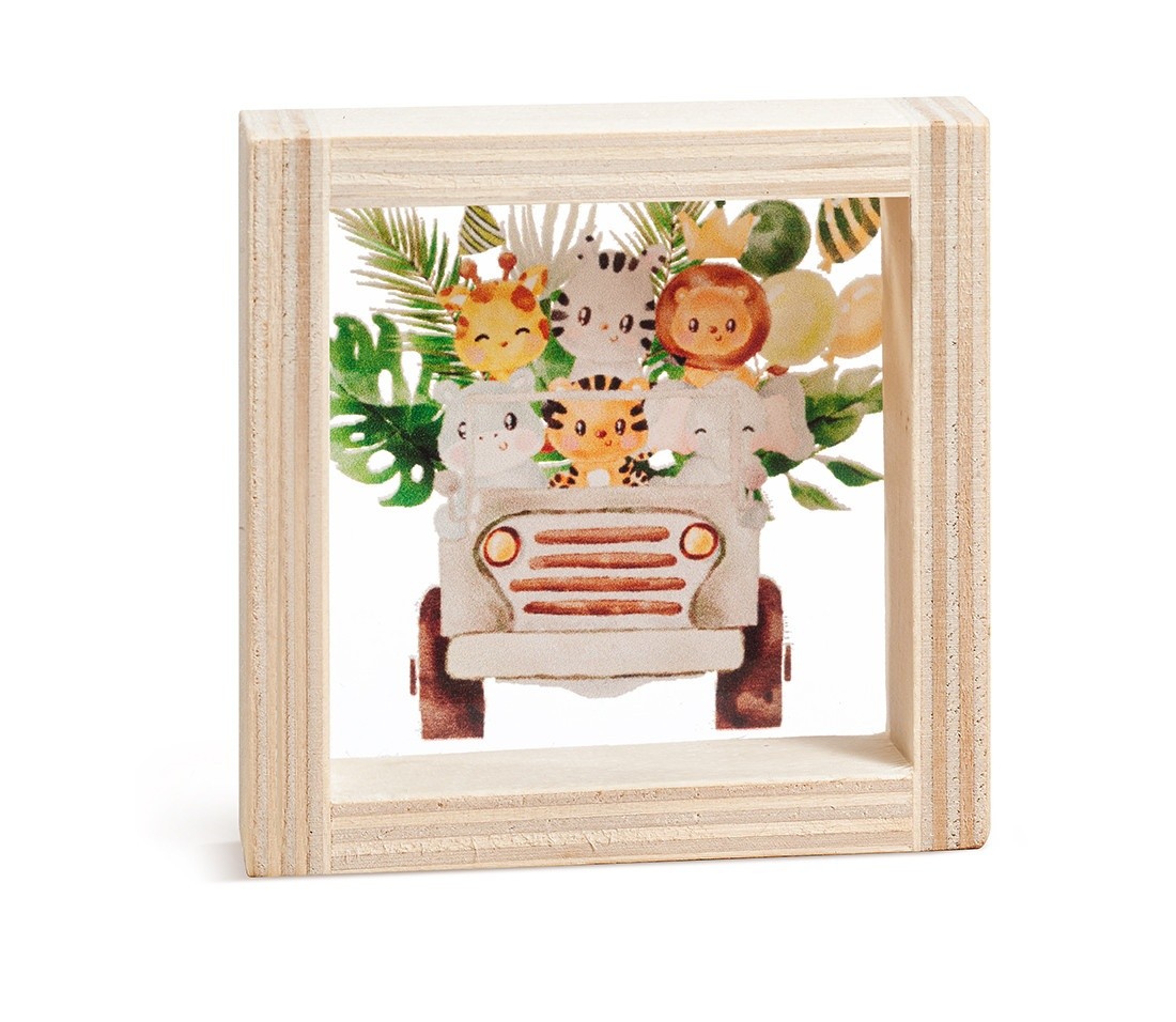 Ξύλινο καδράκι με print plexiglass παράσταση.Η παράσταση απεικονίζει σε διάφανο χρώμα τα ζωάκια της ζούγκλας να πηγαίνουν για safari.