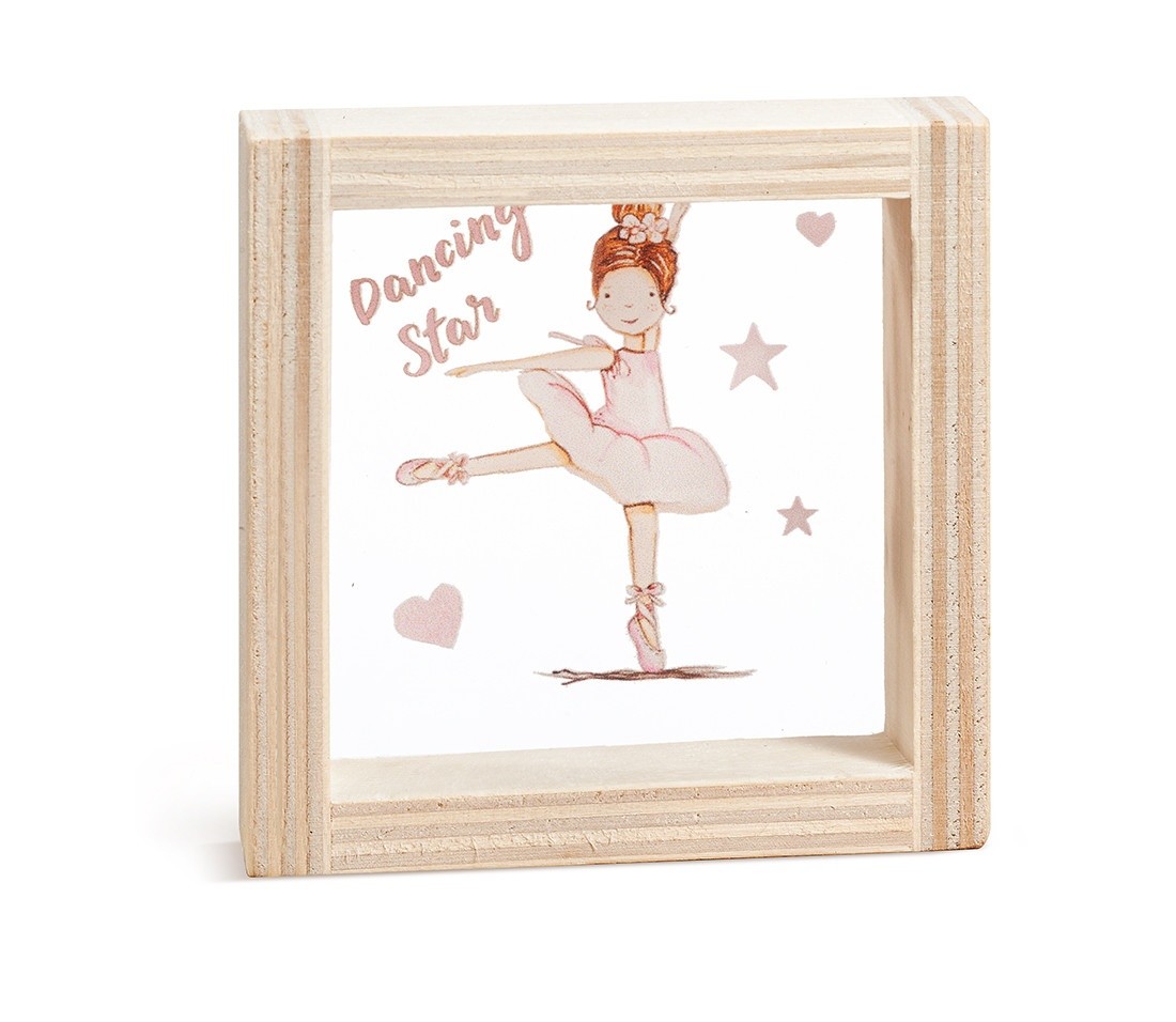Ξύλινο καδράκι με print plexiglass παράσταση.Η παράσταση απεικονίζει σε διάφανο χρώμα μπαλαρίνα ως "dancing star".